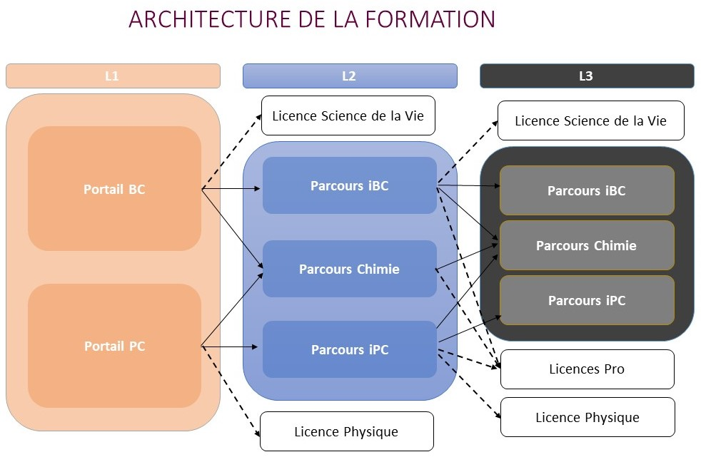 A partir de la deuxième année de la licence l'étudiant choisit entre 2 parcours ("chimie" ou "interface biologie-chimie") auquel s'ajoute un 3ème parcours "Enseignement et Sciences pluridisciplinaires" en troisième année de licence.