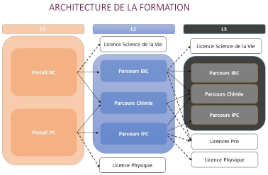 iBC : ce parcours offre une connaissance des deux disciplines biologie et chimie et donc une double compétence disciplinaire et des compétences spécifiques aux thèmes à l’interface des deux disciplines. Le parcours permet d’accéder à un large panel de formations en master aux interfaces entre la biologie et la chimie, ou à des écoles d'ingénieur, dans des domaines variés tels que l’environnement, la santé, la biotechnologie ou l’agroalimentaire par exemple.